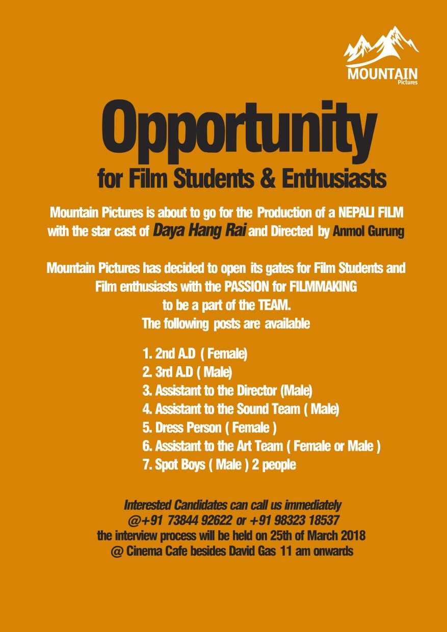 यता चर्चित कलाकार दयाहाङ राईको भारतबाट निर्माण हुन लागेको पहिलो नेपाली चलचित्रमा कार्य गर्न चाहना भएकाहरूका निम्ति सुनौलो अवसर खुलेको छ। चलचित्र निर्माण टोलि ‘माउन्टेन पिक्चर्स्’ ले चलचित्रका निर्माण टोलिमा एकाधिक मानिसहरूको आवश्यक्ता रहेको भन्दै स्थानीय उत्सुक मानिसहरूलाई मौका दिने भएको छ।