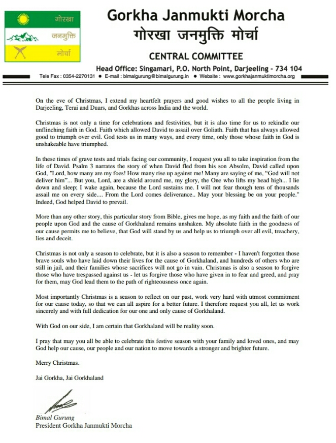 On the eve of Christmas, I extend my heartfelt prayers and good wishes to all the people living in Darjeeling, Terai and Duars, and Gorkhas across India and the world.