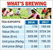 “After a decline in 2016, exports have shown healthy growth. Prices, in terms of dollar, are also better even as it is slightly lower in rupee terms because of the currency fluctuation. However, the net realisation for the industry is higher because of the volume pick-up. As an industry, we should focus on the subcontinent and the Asian markets where consumption is growing. India needs to export at least 50 million kg tea more out of the domestic market,” Azam Monem, chairman of the Indian Tea Association, said.