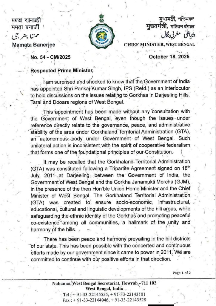 On 18th of October, the West Bengal Chief Minister Mamata Banerjee wrote to the Prime Minister, expressing her “objection to the Central Government’s decision to appoint former IPS officer Pankaj Kumar Singh as interlocutor for discussions on Gorkha-related issues in Darjeeling Hills, Terai, and Dooars”.