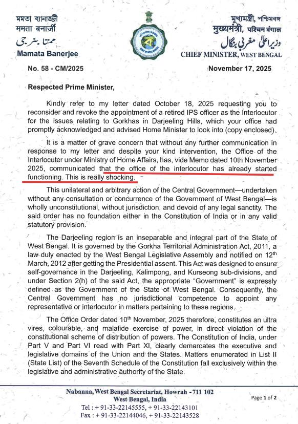 On November 18th, the West Bengal Chief Minister Mamata Banerjee has written another letter to the Prime Minister in which she has claimed, “it is a matter of grave concern that without any further communication in response to my letter and despite your kind intervention, the Office of the Interlocutor under Ministry of Home Affairs, has, vide Memo dated 10th November 2025, communicated that the office of the interlocutor HAS ALREADY STARTED FUNCTIONING, THIS IS REALLY SHOCKING”.