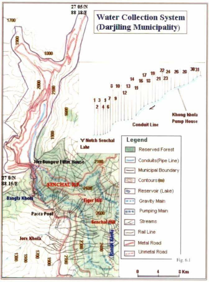 Established in 1850, the Darjeeling municipality (DMC) is one of the oldest city administrative bodies in India and maintains the city administration of the town, covering an area of 10.57 sq km(4.08 sq mi). The water is tapped from about 26 natural springs which originate in the catchment area of Senchel Forest and Wildlife Sanctuary located about 15 km away from the main town. The water from the springs are collected in an arrester tanks fed to a masonry conduit line( about 8km in length) which brings water on gravity to twin Senchel lakes, which were built in1910 and 1932 respectively, and have a combined storage capacity of 125 million litres. Water from these lakes is pressure filtered at Jorebunglow filter house, from where the water is conveyed through large water mains to reservoirs established at St. Pauls tank capacity being 892,646 litres and that of Rock Ville tank being 56,651 litres (MS tank) 219,600 litres (Masonry tanks). From these reservoirs at two placed water is distributed over the town through subsidiary tanks located various places and also directly through mains of various diameters. There are about 19 nos of distribution mains each from Rockville and St Pauls Tank.